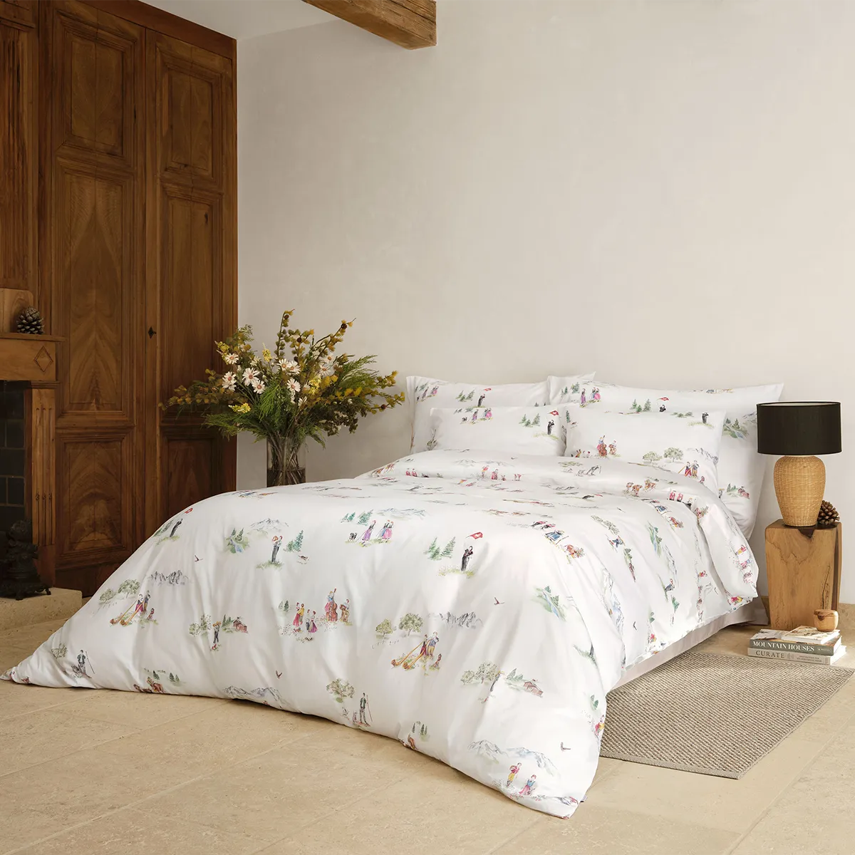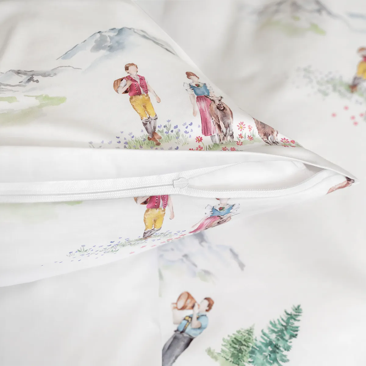 Haben Sie die vielen erzählerischen Details in dieser kleinen Alpsommergeschichte schon entdeckt? Wie vielfältig die Schweizer Sommerbergwelt sich doch präsentiert – geschmückt mit den schönsten Wiesenblumen macht sich der Alpaufzug auf den Weg, über den bunten Trubel hinweg sind die Klänge der Alphornbläser bis weit ins Tal hinunter hörbar, ob der Fahnenschwinger seine Fahne wohl noch höher werfen kann? Saftige Wiesen, soweit wir blicken können, nur die weissen Gipfelspitzen ragen in den blauen Himmel empor, wir freuen uns über diese erfrischende Farbigkeit genau wie die fröhlich springenden Tierkinder. Auf dem weissen Satin erscheint diese illustrative Landschaft schon fast unendlich, bestimmt lässt sich Nacht für Nacht eine neue Geschichte entdecken. Und für das vollumfängliche Alpine Living Gefühl bei Ihnen zuhause lässt sich die Bettwäsche ALMA übrigens wunderbar mit ANDRIN (Vichy-Karo) und FLURINA (Bergwiese) kombinieren.