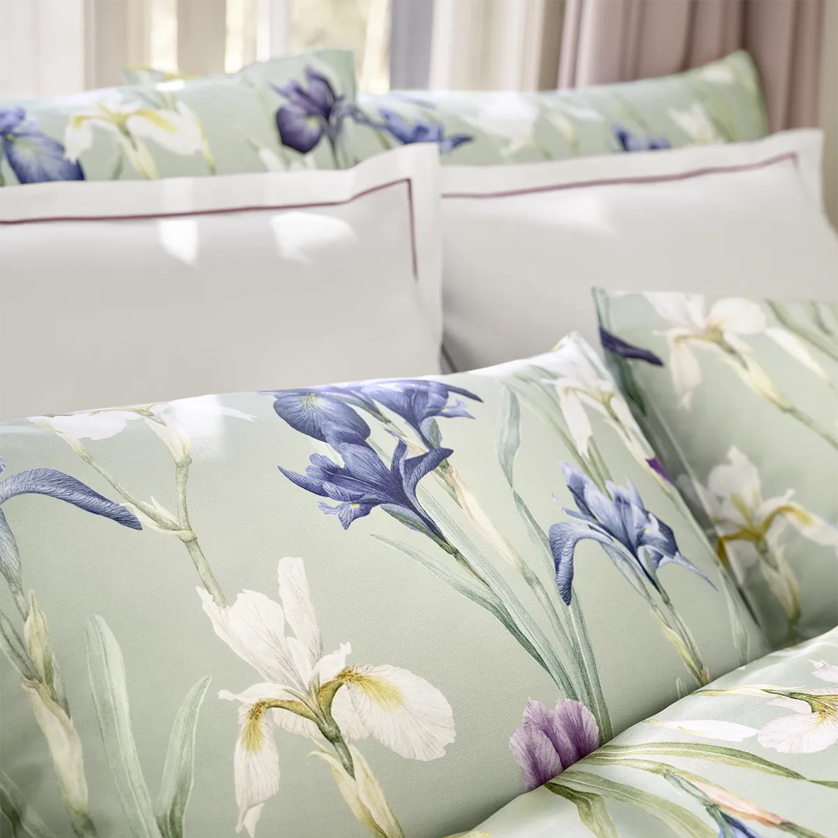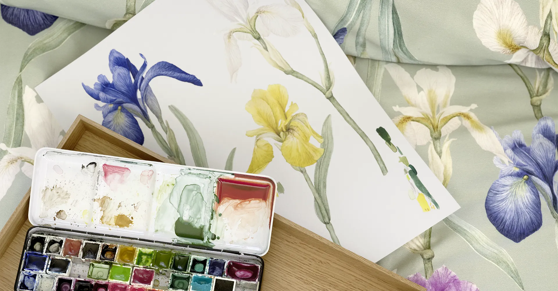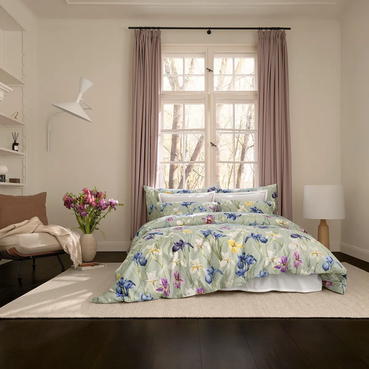 Das Design CHARLOTTE lädt Sie dazu ein, in Ihren eigenen Traumwelten durch eine fast unendliche Wiese voll blühender Schwertlilien zu schreiten. Mit Bewunderung und Hingabe neigen sich die Blütenköpfe auf der Satin-Bettwäsche zu- und voneinander, während sich das Blattwerk im Hintergrund auf den salbeigrünen Fond bettet. Die dunklen und teils kräftig gefärbten Blüten aus Aquarellfarben in samtigem Nachtblau bis Violett, goldenem Gelb und Elfenbein spielen sich in den Vordergrund und geniessen all Ihre Aufmerksamkeit.