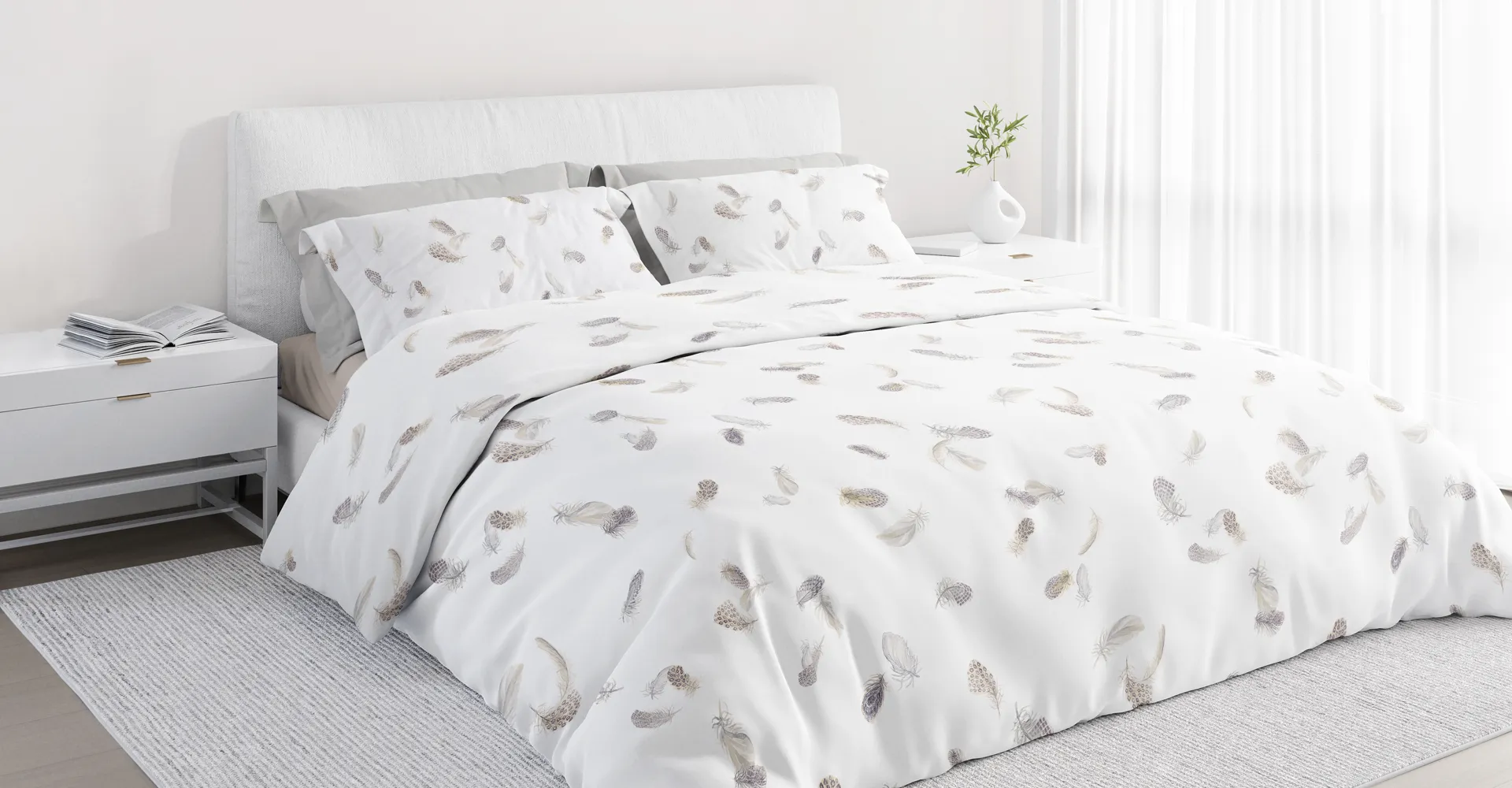 Bei FEDORA schweben zarte, filigrane Federchen in sanft gemusterten Braun-, Grau- und Weisstönen unbeschwert über die reinweisse Bettwäsche – federleicht trägt sie der nächste Windstoss auf und davon in eine neue Traumwelt und schenkt so jedem Schlafzimmer ein harmonisches Bild aus Ruhe, Leichtigkeit und Eleganz.