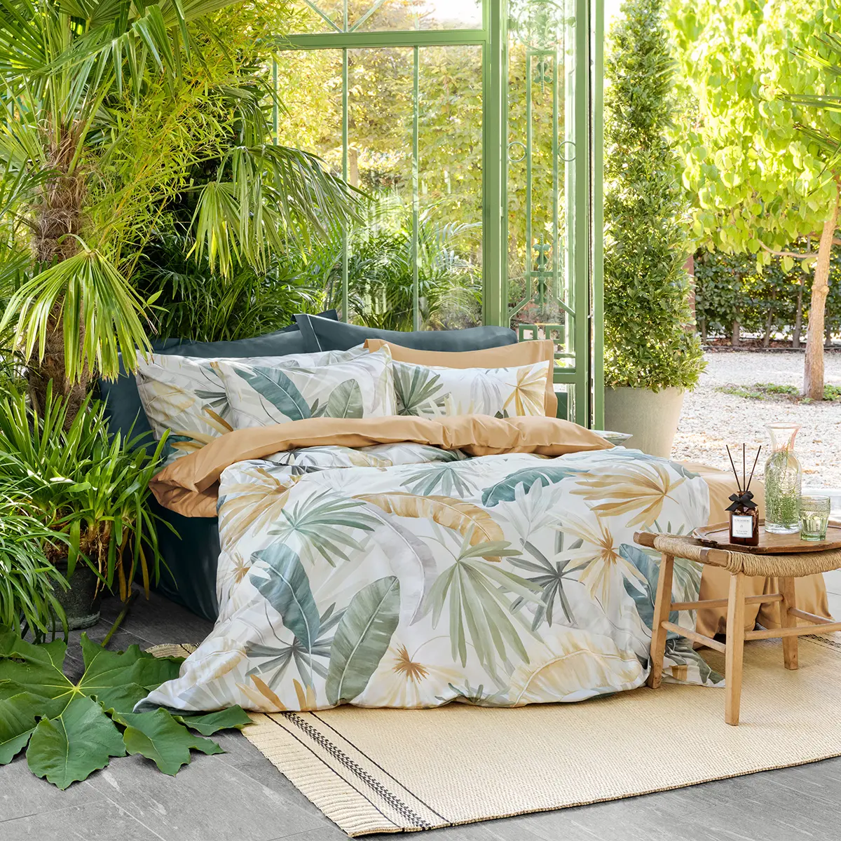 Die Bettwäsche PALMA ist wie ein idyllischer Streifzug durch botanische Gärten, wobei wir den Trubel der Grossstadt vergessen und in Gedanken von einem Ort träumen, an dem die Sonnenstrahlen zwischen grossen Palmblättern in unterschiedlichsten Formen und Arten hervorblinzeln. Das Farbspiel aus Schattierungen entfacht sogar ein leises Kribbeln von Fernweh.