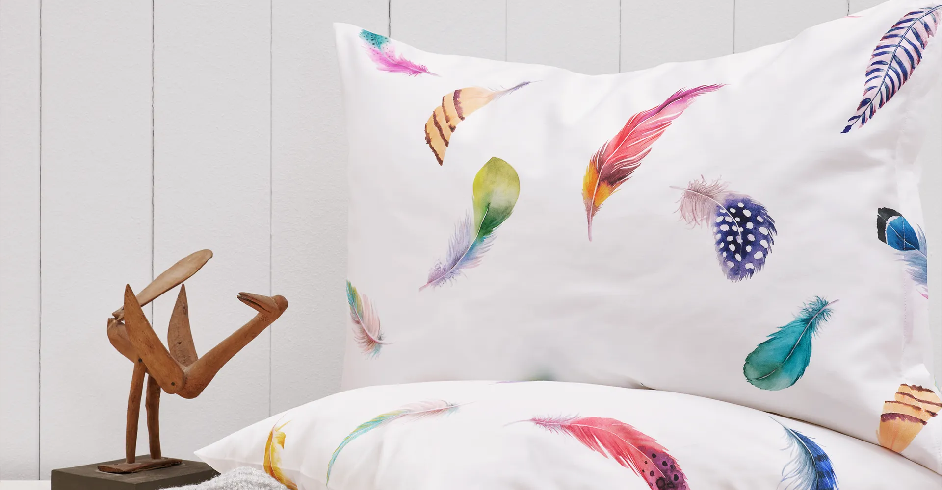 Leuchtend bunte Federn werden von einem leichten Windstoss zum Tanzen und Schweben über den weissen Bettwäsche Fond von TINKA gebracht. Die in Aquarell gezeichneten Schmuckfedern stolzer Paradiesvögel präsentieren sich in hübsch gepunkteter, farbintensiv gestreifter oder auch unifarbener Pracht.