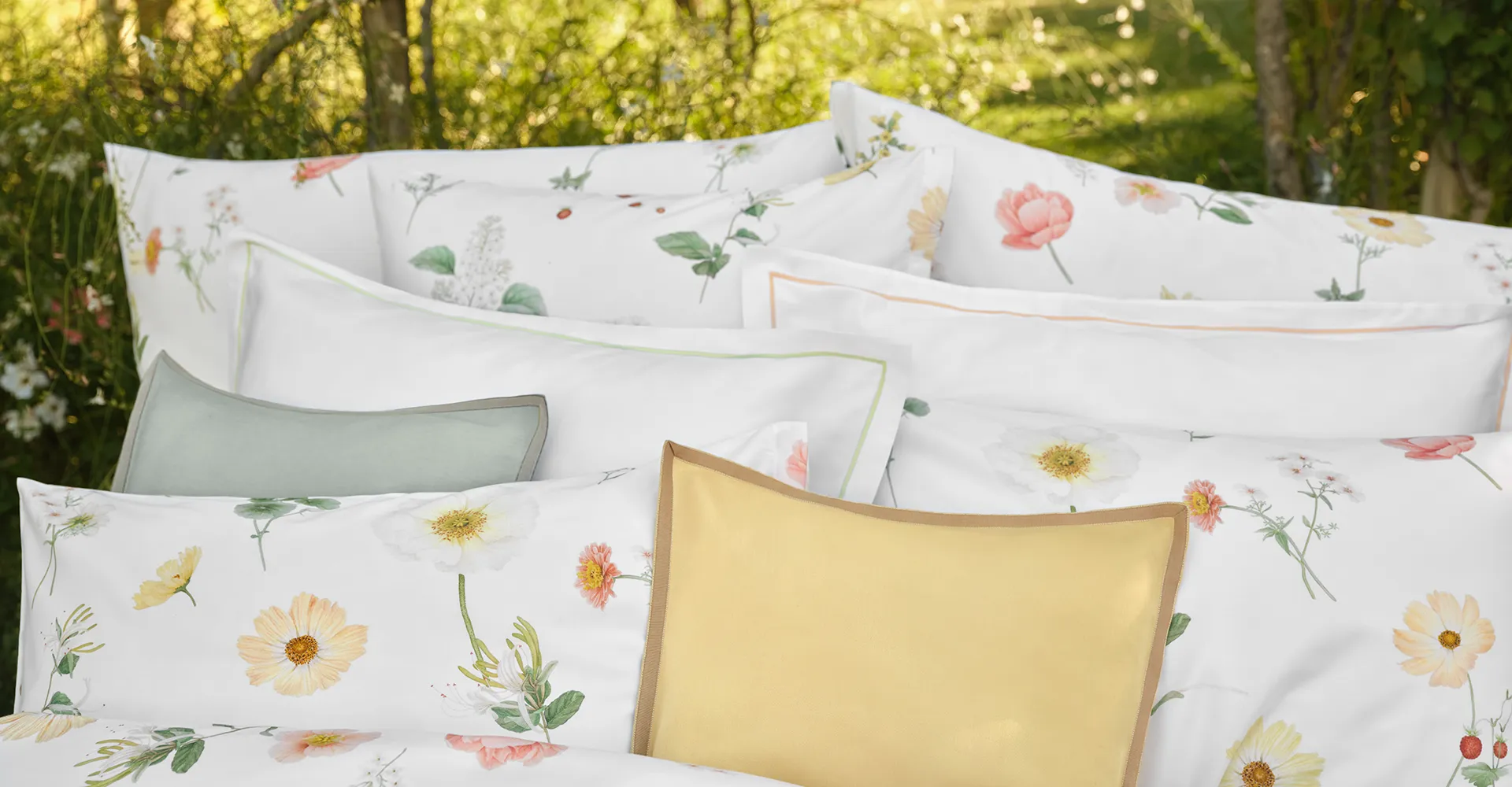 Ein Bettwäsche-Design, das ganz bestimmt frische Sommerlaune pur, Sonnenwärme, Blumenwiesen und schwerelose Leichtigkeit verspricht – orangefarbene Zinnien und Tulpen, Cosmea in zartem Zitronengelb und ein Hauch von Apricot, lachsfarbene Kapuzinerkresse, beiger Phlox, Tabakblüten in Vanillegelb, Geissblatt, weiss-zitronige Mohnblumen, weisser Flieder, kleine hellgrüne Zieräpfelchen, Walderdbeeren in hellem Rot, Minze und gebrochene, frische Weisstöne. ZINNIA steckt voller duftiger Details und lädt garantiert zum nächsten erholsamen Schlaf ein.