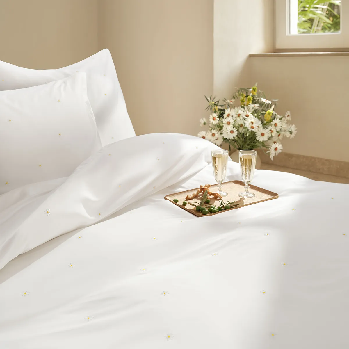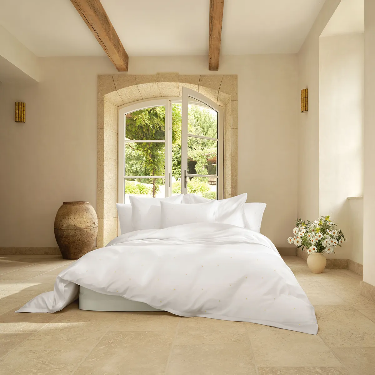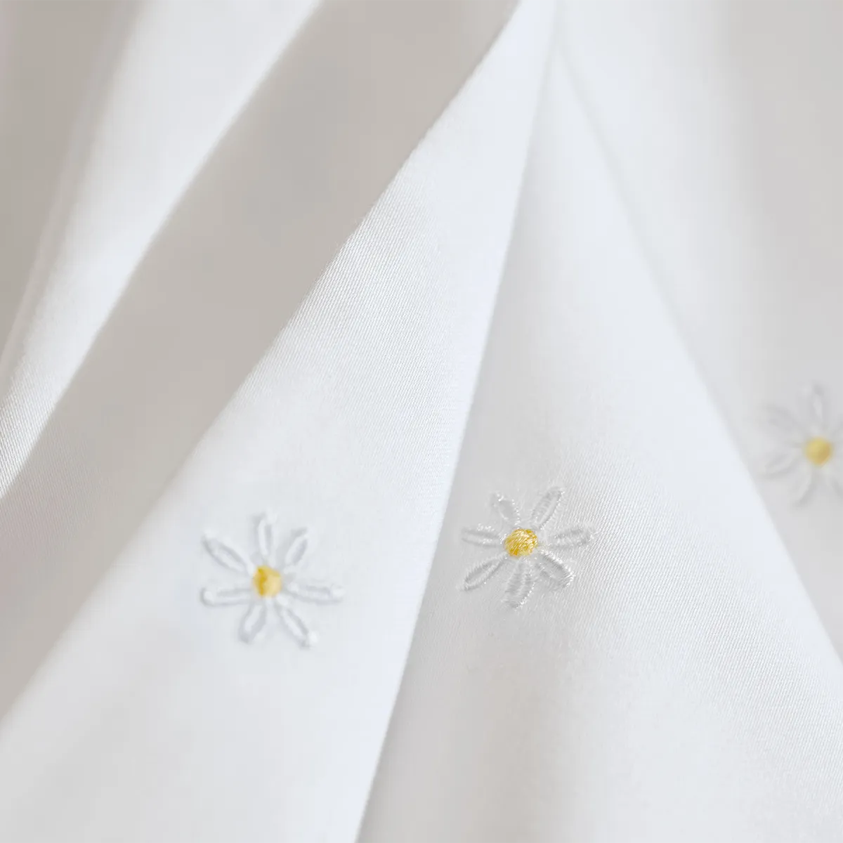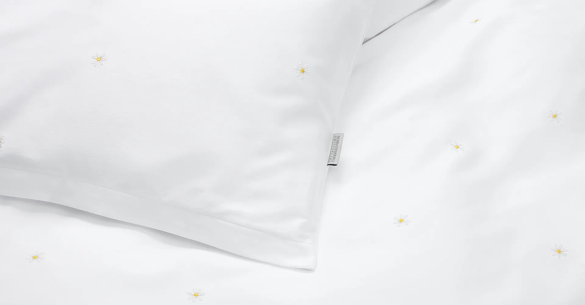 Wo die heimische Gartenwiese wie auch die eigene Bettwäsche die Erinnerungen an Blumenkronen und Sommerboten weckt, da bezaubert DAISY so lieblich, filigran und wunderbar leicht zugleich mit ihren aufgestickten Gänseblümchen – zierlich und erhaben tänzeln die kleinen Schmuckstücke auf der Oberseite über den reinweissen Satin, wird doch erst beim genauen Betrachten klar, wie individuell jede Blüte erscheint. Zeitlos, klassisch und elegant weht mit DAISY garantiert bald eine sanfte Brise Sommer hinein ins Schlafzimmer.