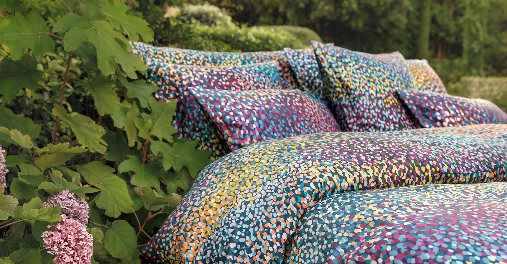 Inspiriert von pointillistischen Gemälden oder auch dem Anblick einer blühenden Sommerwiese aus luftigen Höhen zieht die Bettwäsche JANA fast unwiderstehlich in ihren Bann und lädt dazu ein, in dieses berauschende Meer aus Farbtupfern einzutauchen. Zahlreiche Nuancen aus goldenem Ocker, samtigem Veilchenblau, silbernem Grau, Blau- und Grüntönen wollen von Nahem entdeckt werden und laden in den herrlich blühenden Garten ein – aufgetragen in Handarbeit und in mehreren Schichten entsteht auf dem leuchtend, dunkelblauen Hintergrund das organische, lebendige Design in Gouache.