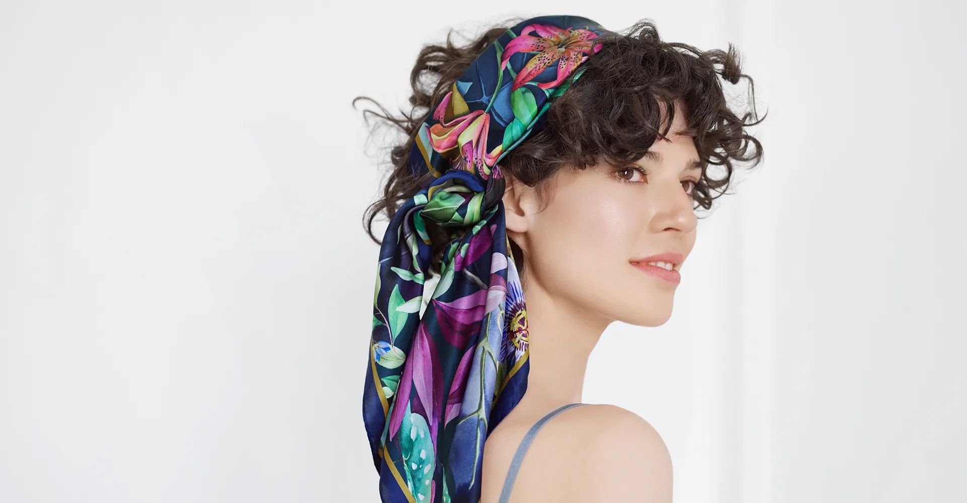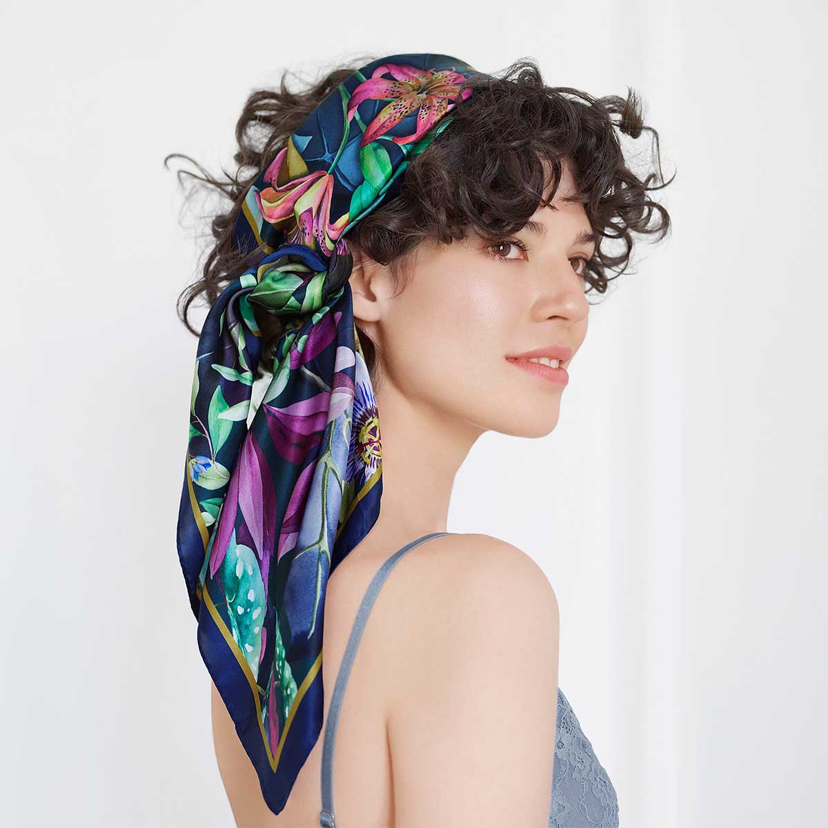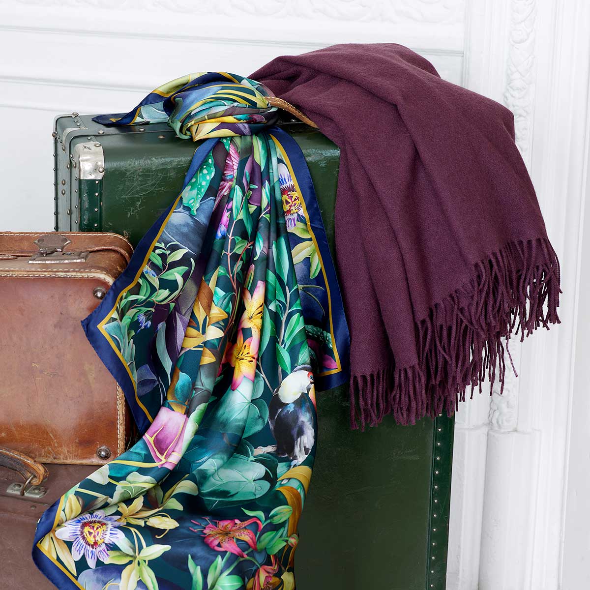 Ein hochwertiges Accessoire nicht nur für den Hals, sondern auch als Kopfschmuck: Die detailreichen Motive des Foulards JANE mit tropischer Exotik und Dschungel-Feeling harmonieren perfekt mit den farbintensiven Herbsttönen der Blätterwelt im Fond des feinen Seidentuchs.