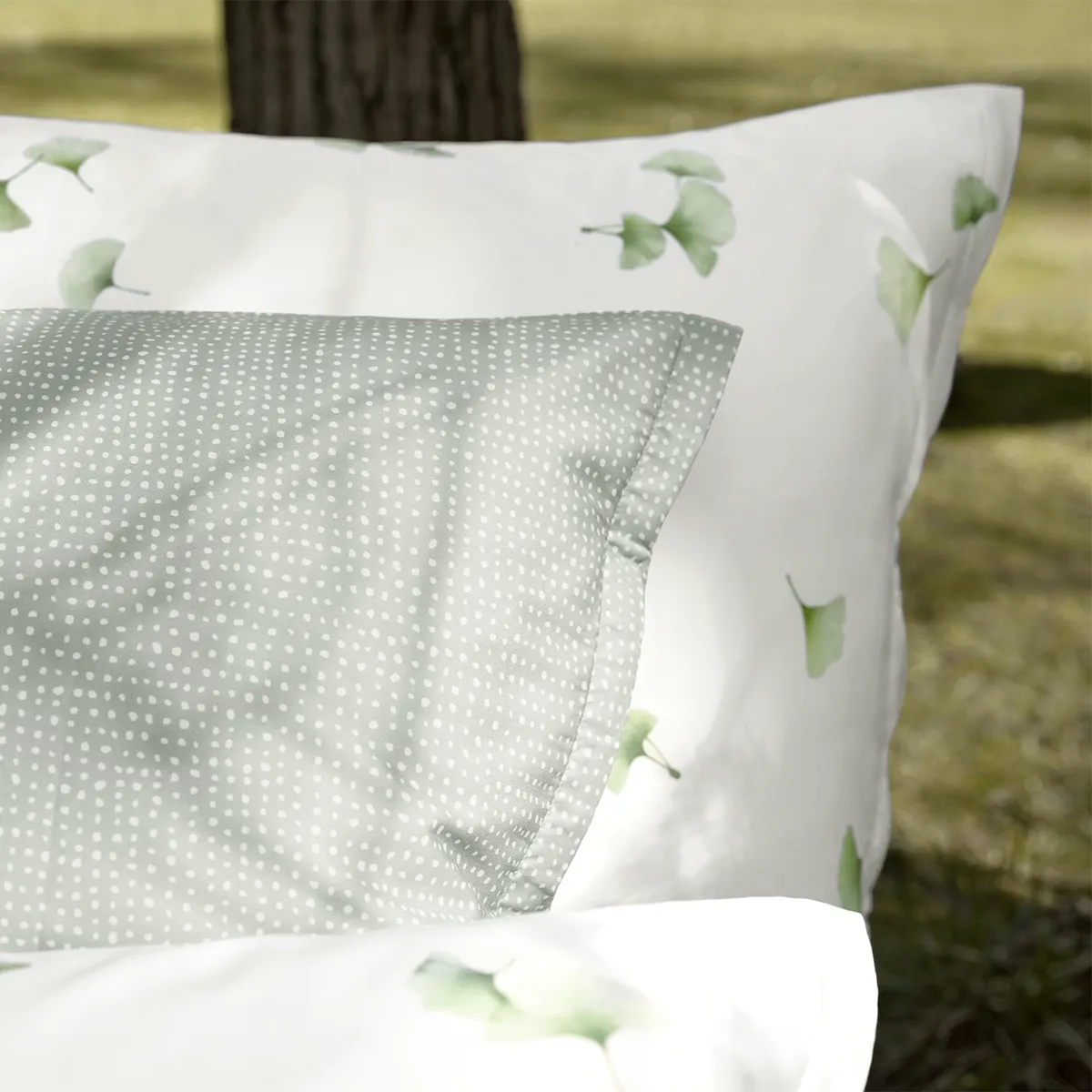 On the AIKO bed linen, delicate ginkgo leaves in nuanced shades of green float across the pure white sateen – almost as if they were dancing in a gentle summer breeze. The watercolor painting technique lends these delicate leaves a light transparency, while the subtle color gradients and the fine details of the leaf veins add depth and a touch of naturalness. This understated, simple design is guaranteed to give your bedroom a unique Zen garden tranquility.