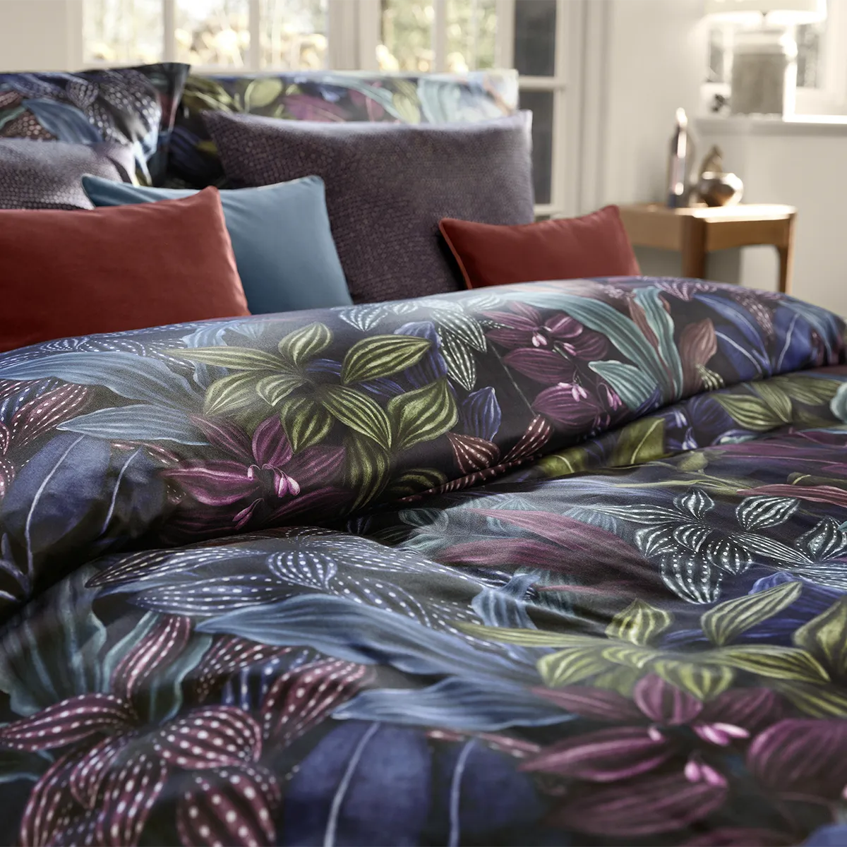 A mysterious whisper rustles through the dense foliage of the ARAMIS bed linen, but it could also be a gentle gust of wind. This diverse fantasy forest of gouache colors in bright copper red, magenta, olive, sea green and royal blue looks magically attractive on the sateen fabric or on the jersey fabric. While the dark shades of blue accompany you into the depths of your own magical dream worlds, brightly lit accents skillfully distract your gaze time and again.