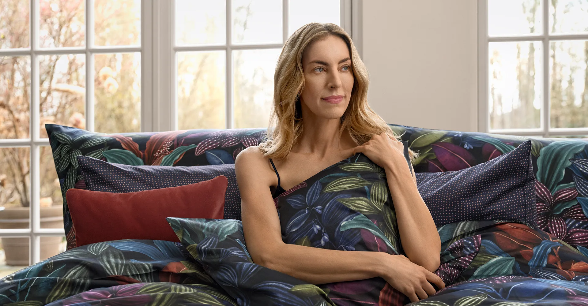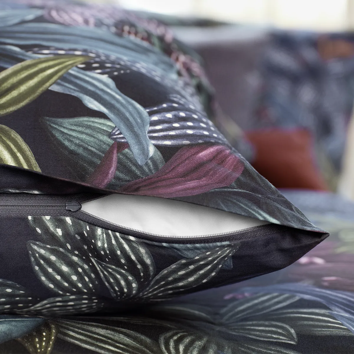 A mysterious whisper rustles through the dense foliage of the ARAMIS bed linen, but it could also be a gentle gust of wind. This diverse fantasy forest of gouache colors in bright copper red, magenta, olive, sea green and royal blue looks magically attractive on the sateen fabric or on the jersey fabric. While the dark shades of blue accompany you into the depths of your own magical dream worlds, brightly lit accents skillfully distract your gaze time and again.