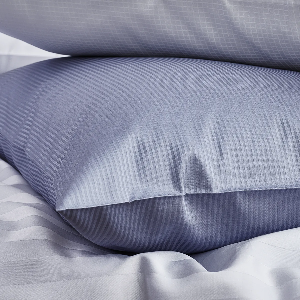 Bettwäsche Marquise in reinem Weiss mit dezenten, horizontalen Streifen, perfekt für ein stilvolles und zeitloses Schlafzimmer.Detailansicht der Bettwäsche Marquise in Blau und Weiss mit feinen Streifen, die die weiche und hochwertige Textur des Stoffes betonen.