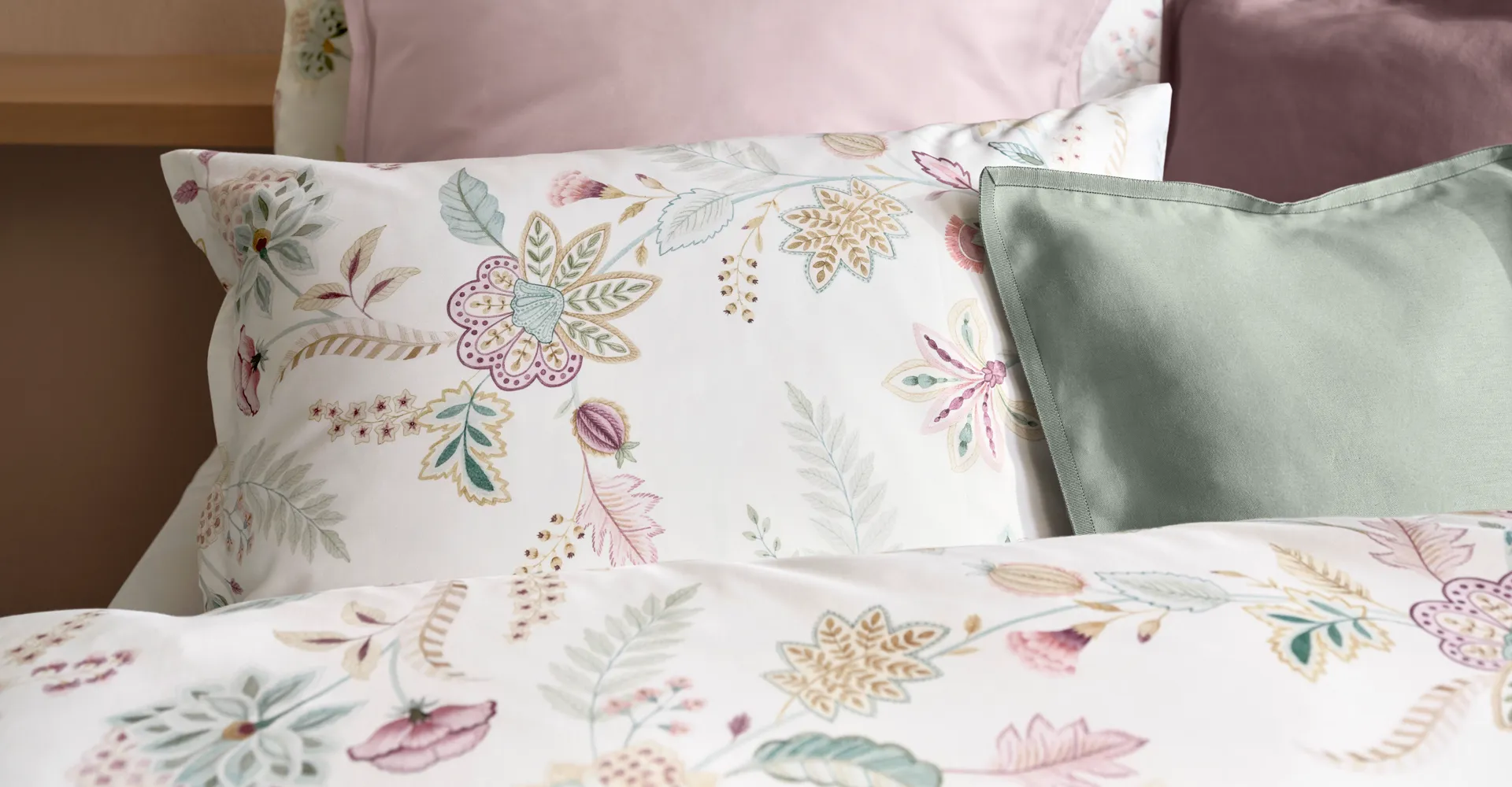 When the low sun casts its shadows through the open window and a warm summer night is on the way, IMA adds a subtle touch of the Far East. This classic ornamental bed linen with stylised flowers and leaves comes in a muted, elegant colour scheme of sage green, sand beige and powdery aubergine, combined with a fresh coral accent, and is sure to make you dream of your next holiday every night.