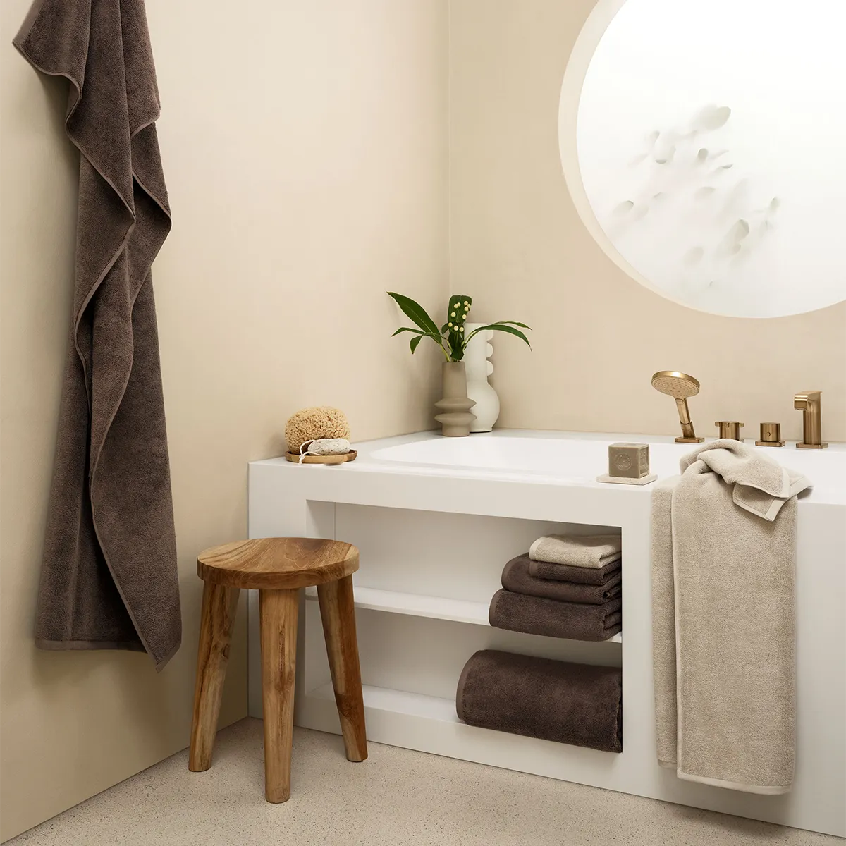 The newly developed COSHMERE GOTS terry toweling from Schlossberg is a faithful companion in all areas of your bathroom – whether you wrap yourself in the large bath towel after a refreshing shower, bury your toes in the fluffy bath rug after a long bubble bath or put a smile on your own face and that of your guests with the hand and guest towels, this terry toweling will impress you time and again with its incomparable softness and extremely high absorbency. Thanks to the terry loops on both sides, it is particularly supple to touch and literally ensures all-round high-quality comfort of wellbeing. In twelve harmonious and versatile colors and different sizes, COSHMERE GOTS terry toweling offers you a wide selection to meet your own needs and furnishing requirements. What's more, this terry toweling is always a sustainable choice thanks to its GOTS certification and its production from 100% organic cotton.