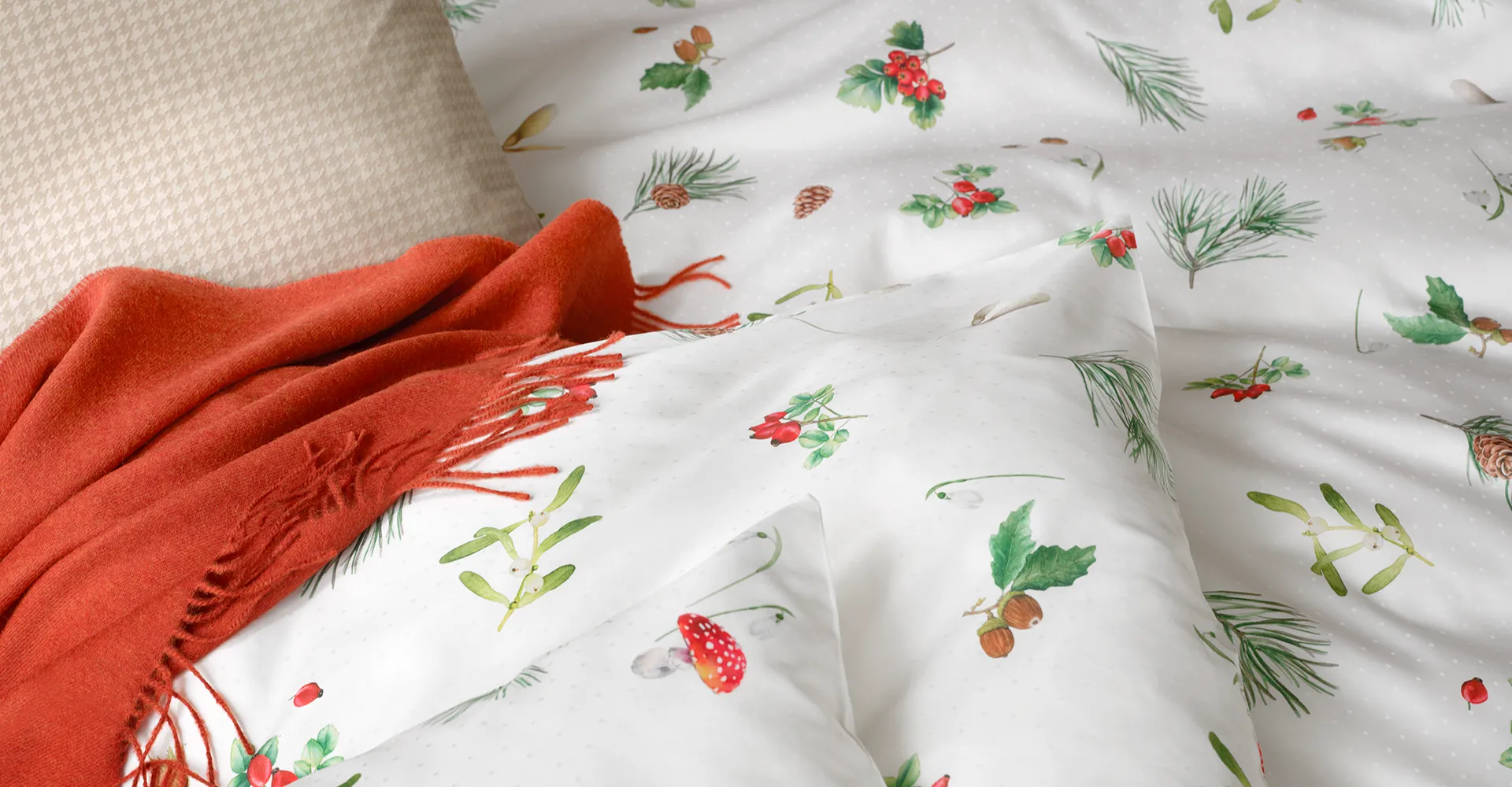 The magic of a winter forest, captured on the HAZEL bed linen. Found objects from pinecones to rose hips and mistletoe to snowdrops present themselves on the white background - the iridescent dots are reminiscent of snowflakes - and thus give every bedroom its own magic.