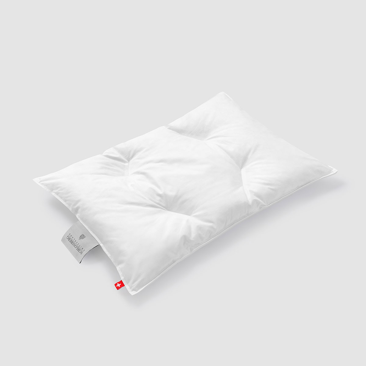 The fluffy goose down and feathers in this flat one-chamber pillow ensure optimal moisture wicking and temperature management. The filling is encased in a breathable, hydrophilic cotton cover. The soft pillow supports the head, but is flat due to the four additional quilting seams and therefore perfectly suitable for children of three years and above. Suitable for people allergic to house dust. Swiss Made.