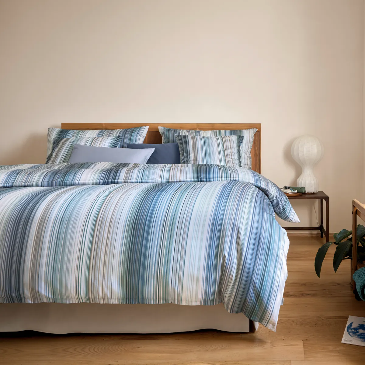 Heavy summer rain or simply a welcome change of perspective? The bed linen LORIS is painted in a timeless striped design and impresses with its calm aura. The composition of narrow and wide sections and subtle contrasts between dark and light tones may provide surprising inspiration to sketch your own impressions – or to celebrate the rhythmic aspects of life in your dreams.