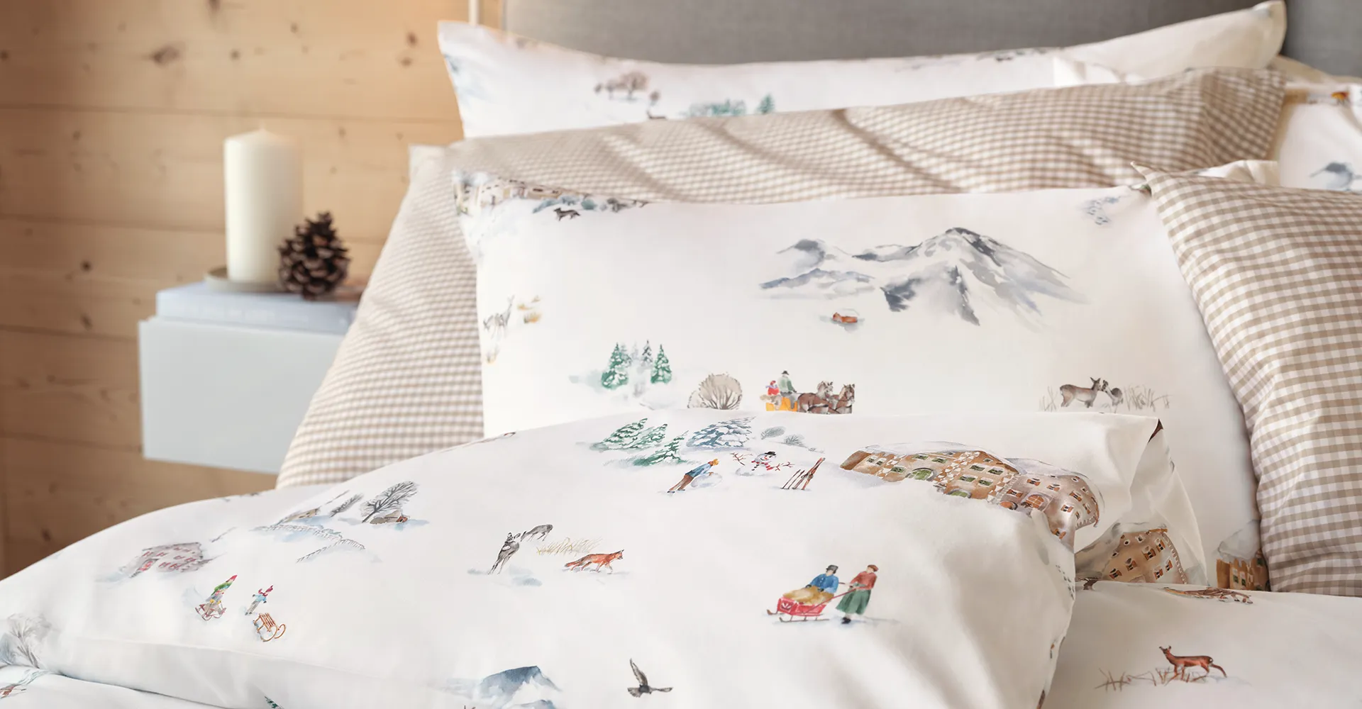 Die illustrative Bettwäsche MONTAGNA erzählt eine kleine Wintergeschichte in einer verschneiten Landschaft; kleine Häuschen mit Sgraffito Fassaden umgeben von der Schweizer Bergwelt, ein Adler, der seine Runden um die Gipfel dreht, schneebedeckte Dächer mit Eiszapfen, ein Pferdeschlitten entlang des Flusslaufes, Rehe und Füchse streifen durch die Winterwelt. Was gibt es in dieser detailverliebten Bettwäsche noch alles zu entdecken? Bestimmt entdecken Sie jeden Abend eine neue kleine Geschichte.
