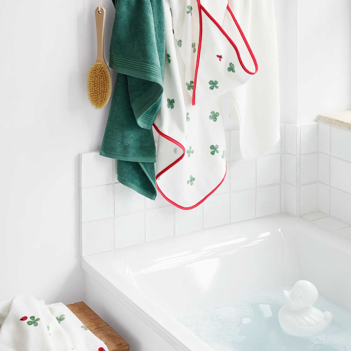 With the LUCKY hooded towel, drying off after bathing and splashing around becomes a moment of happiness: four-leaf clovers and bright red ladybugs present a stunning variety of lucky charms – for a good mood in the morning or as a guaranteed personal lucky charm for our favorite little ones.